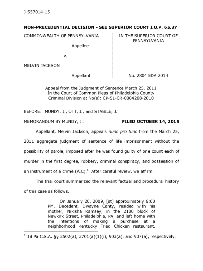 JS5701415NONPRECEDENTIAL DECISION SEE SUPERIOR COURT I.O.P. 65.37 COMMONWEALTH OF PENNSYLVANIAN THE SUPERIOR COURT OF PENNSYLVANIAAppellee v. MELVIN JACKSON Appellant No. 2804 EDA 2014Appeal from