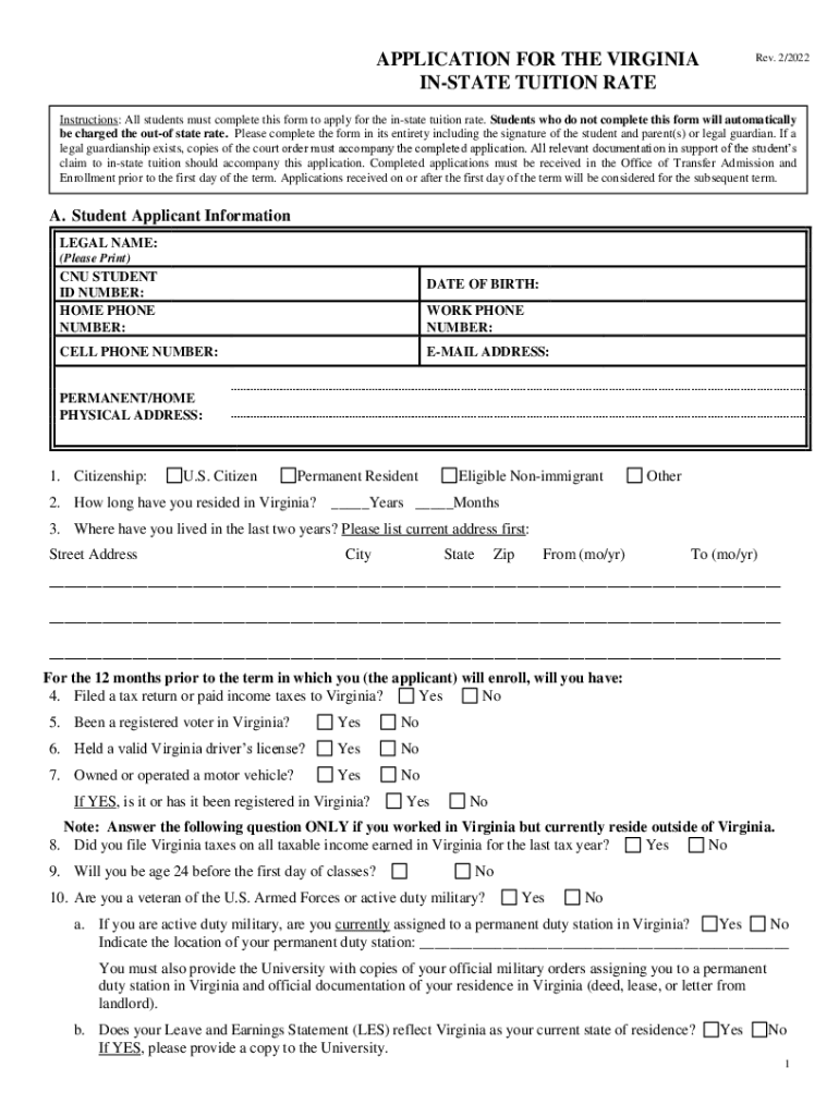 APPLICATION FOR THE VIRGINIA INSTATE TUITION RATE Rev. 2/2022Instructions: All students must complete this form to apply for to instate tuition rate. Students who do not complete this form will automatically