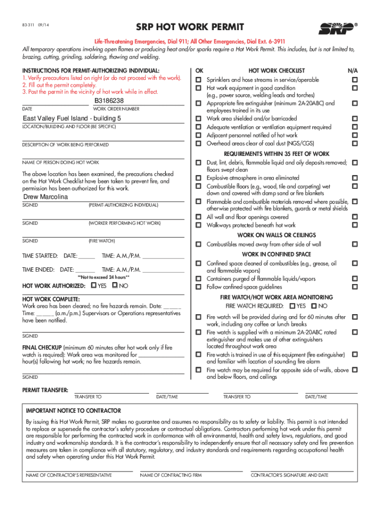 SRP HOT WORK PERMIT8331109/14LifeThreatening Emergencies, Dial 911; All Other Emergencies, Dial Ext. 63911 All temporary operations involving open flames or producing heat and/or sparks require a
