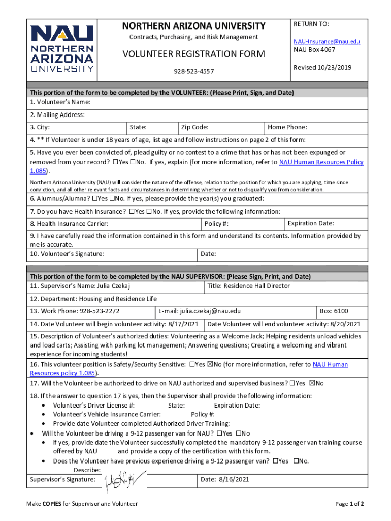 RETURN TO:NORTHERN ARIZONA UNIVERSITY Contracts, Purchasing, and Risk ManagementNAUInsurance@nau.eduNAU Box 4067VOLUNTEER REGISTRATION FORMRevised 10/23/20199285234557This portion of the form to be