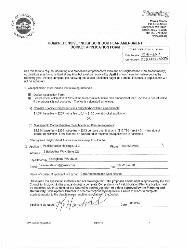 Permit Center 210 Lottie Street Bellingham, WA 98225 phone:3607788300 fax: 3607788301 www.cob.orgCOMPREHENSIVE I NEIGHBORHOOD PLAN AMENDMENT DOCKET APPLICATION FOR MTO BE COMPLETED BY Stalemate Received