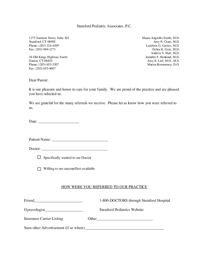 Stamford Pediatric Associates, P.C. 1275 Summer Street, Suite 301 Stamford, CT 06905 Phone: (203) 3244109 Fax: (203) 9691271Maura AngielloSmith, M.D. Amy E. Cram, M.D. Lam bros G. Geodes, M.D. Debra