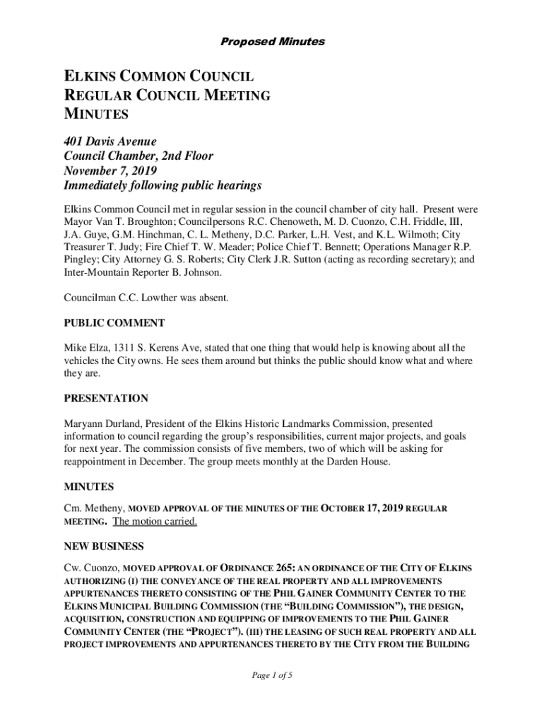 Proposed MinutesELKINS COMMON COUNCIL REGULAR COUNCIL MEETING MINUTES 401 Davis Avenue Council Chamber, 2nd Floor November 7, 2019, Immediately following public hearings Elkins Common Council met