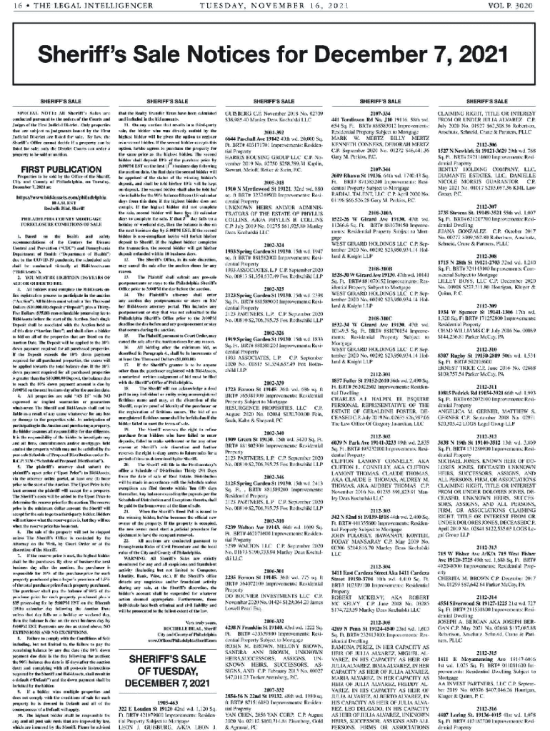 VOL P. 3021T U E S D A Y, N O V E M B E R 1 6, 2 0 2 1THE LEGAL INTELLIGENCE 17SHERIFFSSALESHERIFFSSALESHERIFFSSALESHERIFFSSALESHERIFFSSALESEBRENA BASKERVILLEPERRY AKA