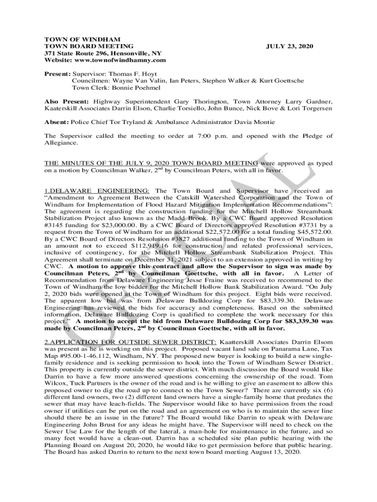 TOWN OF WYNDHAM TOWN BOARD MEETING 371 State Route 296, Bentonville, NY Website: www.townofwindhamny.comJULY 23, 2020Present: Supervisor: Thomas F. Host Councilmen: Wayne Van Valid, Ian Peters, Stephen