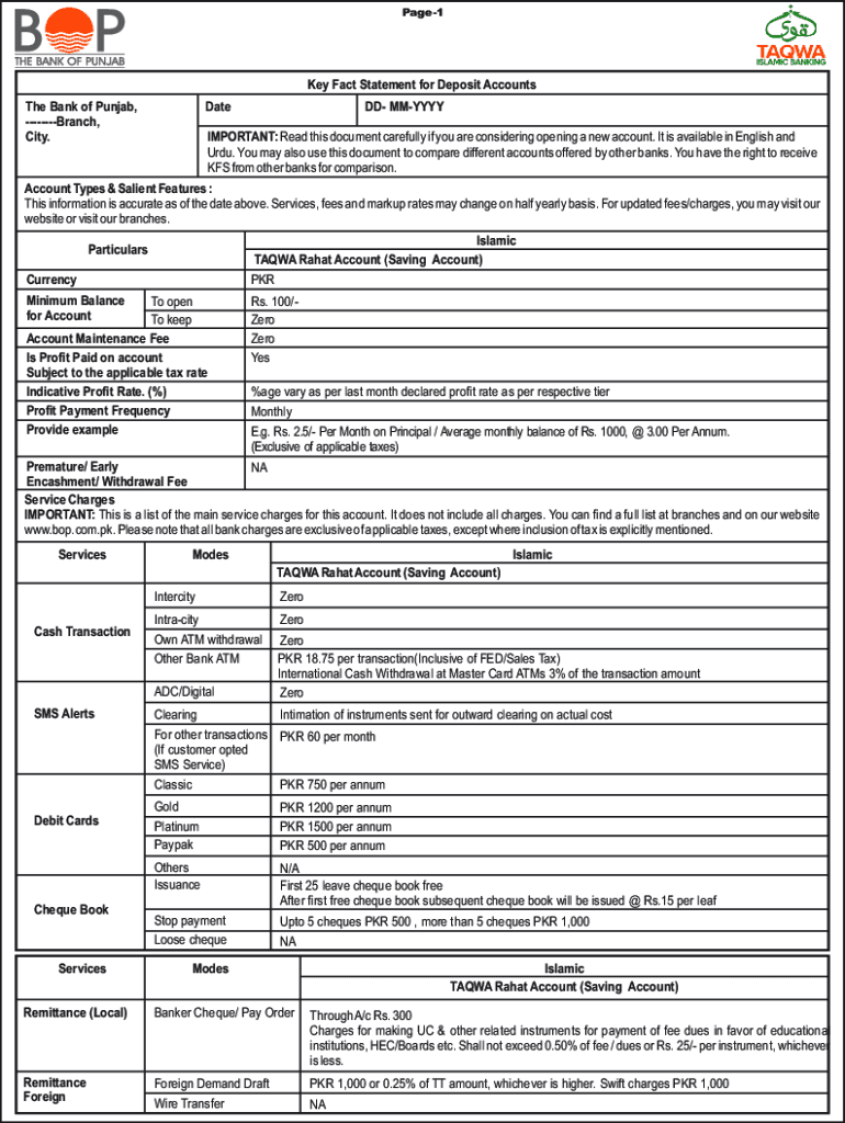 Page1Key Fact Statement for Deposit Accounts The Bank of Punjab, Branch, City. Dated MMYYYYIMPORTANT: Read this document carefully if you are considering opening a new account. It is available in