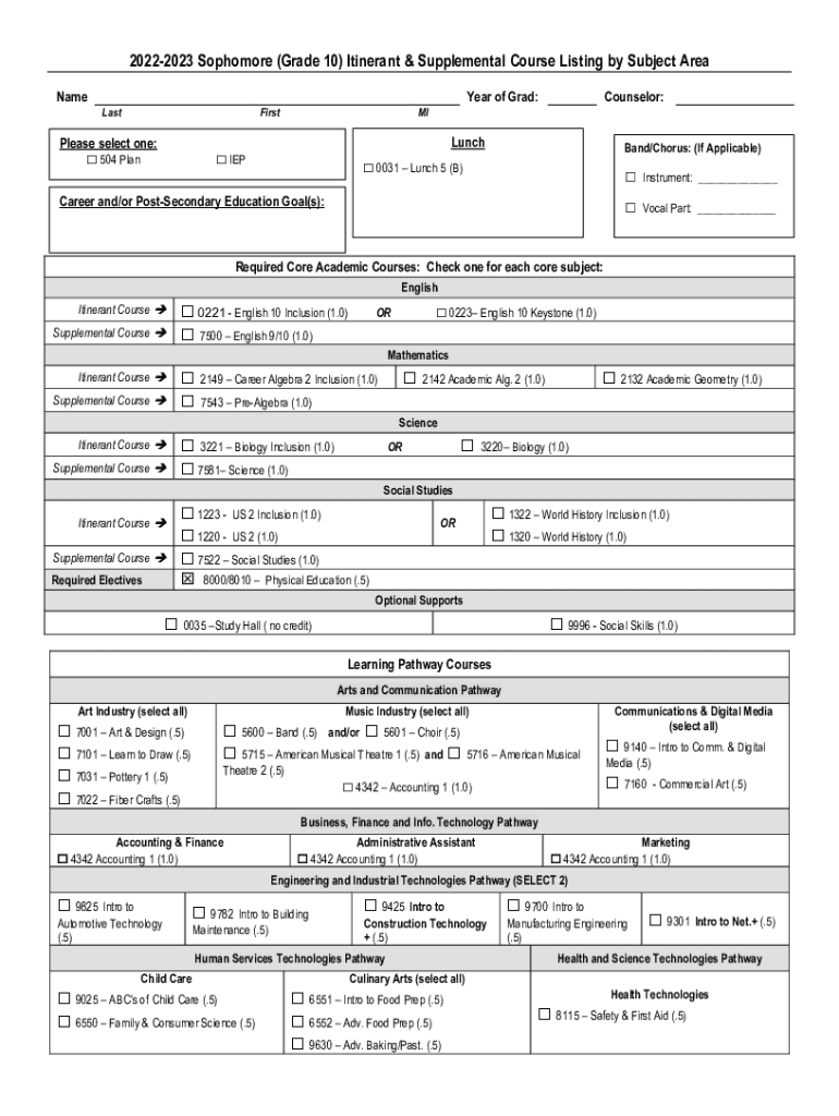 20222023 Sophomore (Grade 10) Itinerant & Supplemental Course Listing by Subject Area