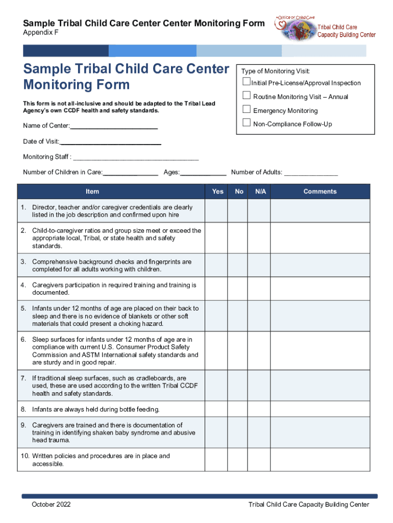 Sample Tribal Child Care Center Monitoring Form Appendix Sample Tribal Child Care Center Monitoring Form This form is not all-inclusive and should be adapted to the Tribal Lead Agency sown CCD health