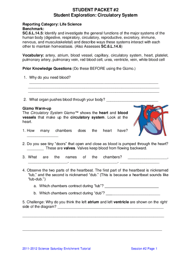 STUDENT PACKET #2 Student Exploration: Circulatory System Reporting Category: Life Science Benchmark: SC.6. L.14.5: Identify and investigate the general functions of the major systems of the human