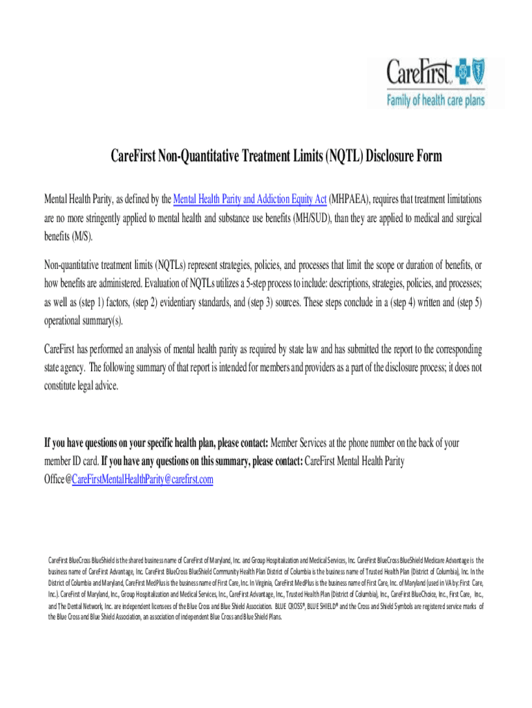 Get the free Non-Quantitative Treatment Limits (NQTL) Disclosure Form. Non-Quantitative Treatment...