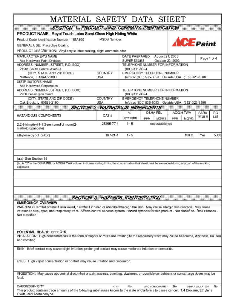 MATERIAL SAFETY DATA SHEET SECTION 1 PRODUCT AND COMPANY IDENTIFICATION PRODUCT NAME: Royal Touch Latex SemiGloss High Hiding White Product Code Identification Number: 186A100MSDS Number:GENERAL USE: