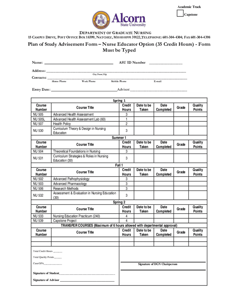 15 CAMPUS DRIVE, POST OFFICE BOX 18399, NATCHEZ, MISSISSIPPI 39122,TELEPHONE: 6013044304; FAX 6013044398Plan of Study Advisement Form Nurse Educator