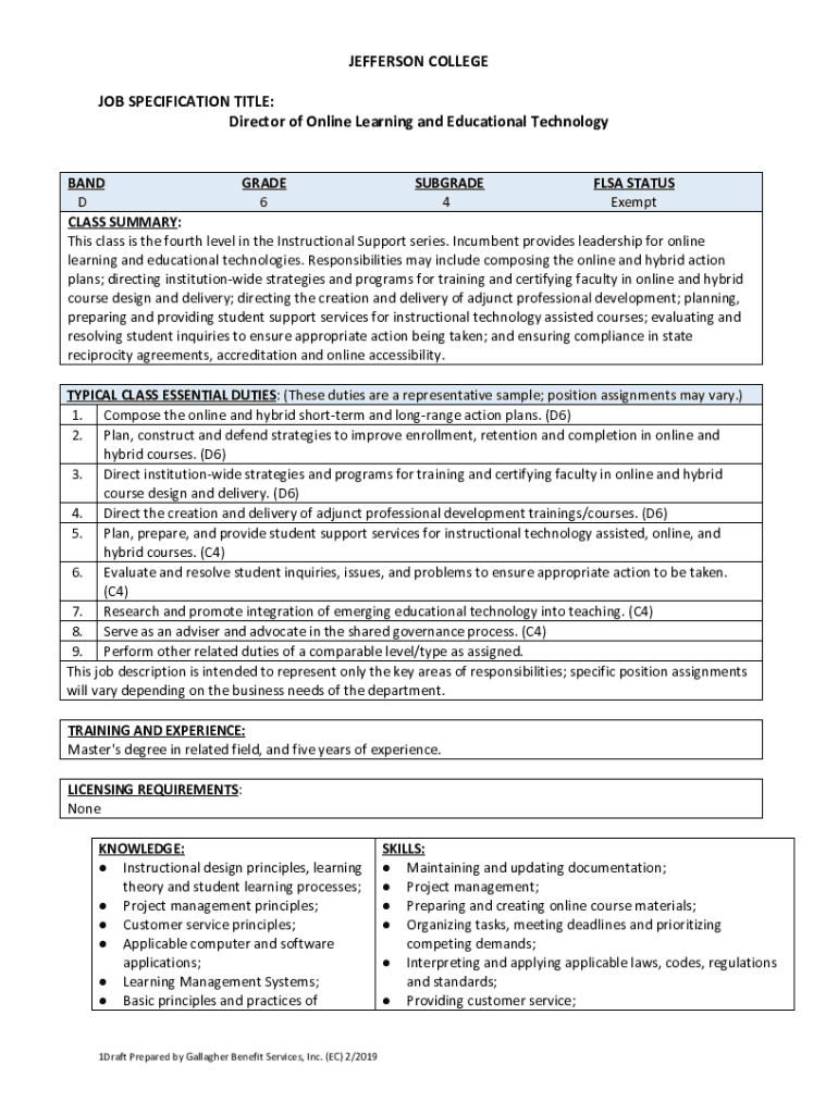 JEFFERSON COLLEGE JOB SPECIFICATION TITLE: Director of Online Learning and Educational TechnologyBAND GRADE UPGRADE FLEA STATUS D 6 4 Exempt CLASS SUMMARY: This class is the fourth level in the Instructional