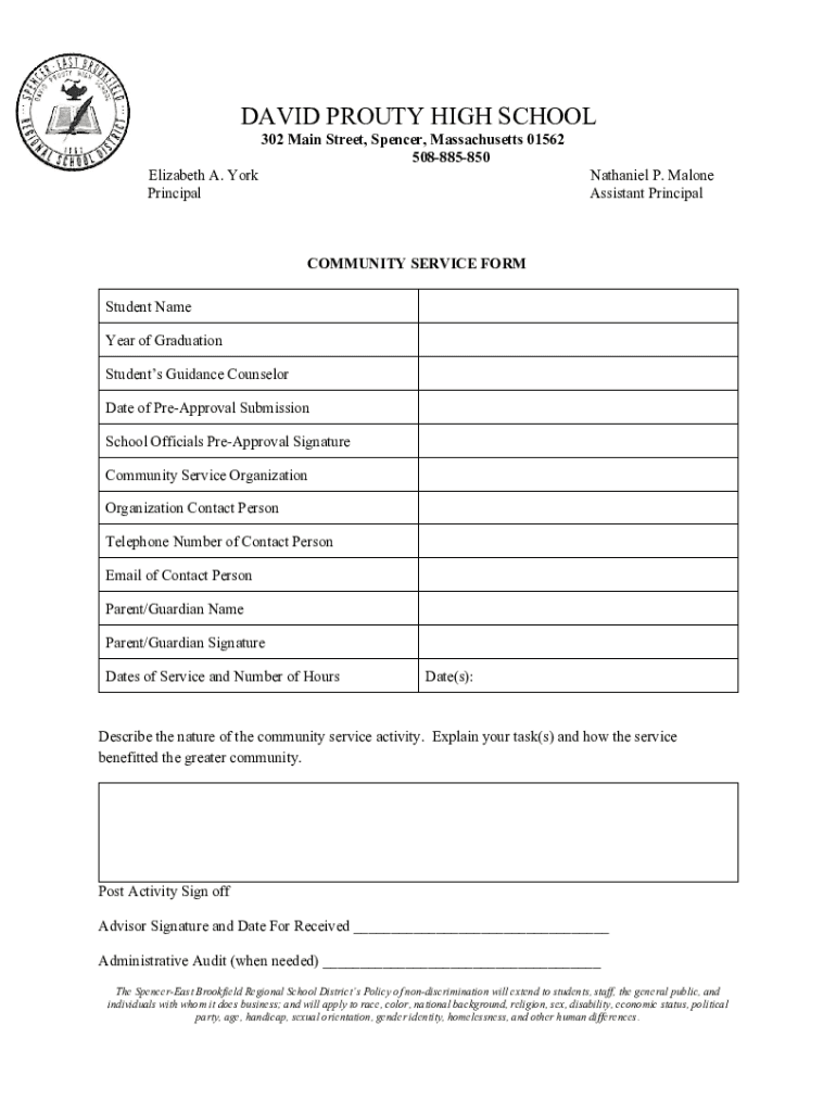 DAVID POUTY HIGH SCHOOL 302 Main Street, Spencer, Massachusetts 01562 508885850 Elizabeth A. York Principal Nathaniel P. Malone Assistant PrincipalCOMMUNITY SERVICE FORM Student Name Year of Graduation