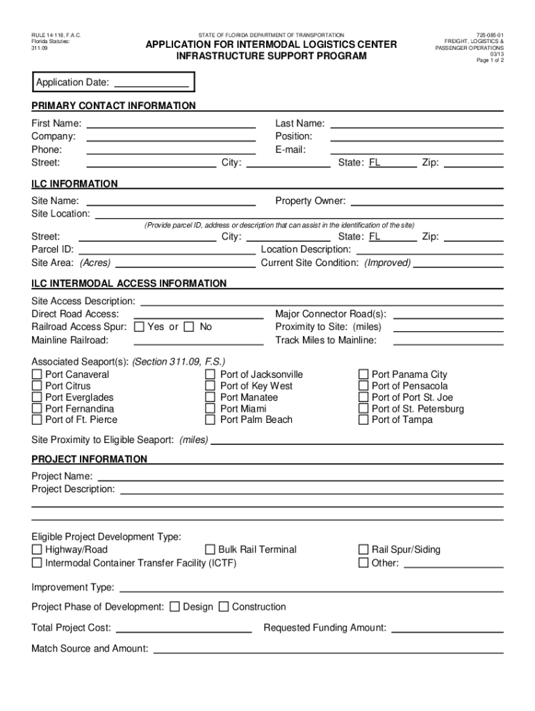 RULE 14118, F.A.C. Florida Statutes: 311.09STATE OF FLORIDA DEPARTMENT OF TRANSPORTATIONAPPLICATION FOR INTERMODAL LOGISTICS CENTER INFRASTRUCTURE SUPPORT PROGRAM72508501 FREIGHT, LOGISTICS & PASSENGER