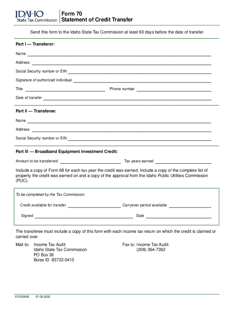 Get the free Form 70, Statement of Credit Transfer and Instructions approved - tax idaho