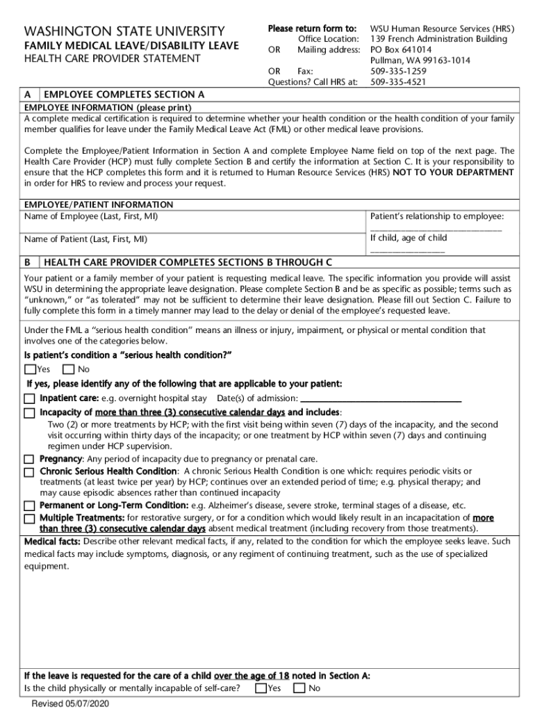 WASHINGTON STATE UNIVERSITYFAMILY MEDICAL LEAVE/DISABILITY LEAVE HEALTH CARE PROVIDER STATEMENTPlease return form to: Office Location: OR Mailing address: OR Fax: Questions? Call HRS at:WSU Human