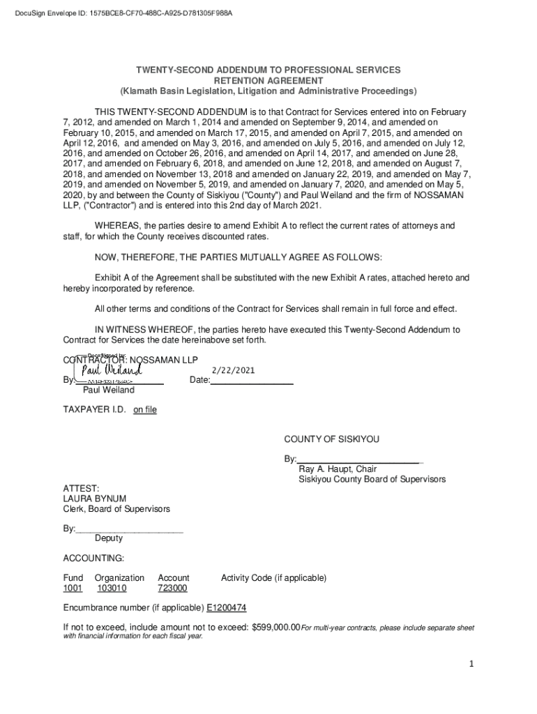DocuSign Envelope ID: 1575BCE8CF70488CA925D781305F988ATWENTYSECOND ADDENDUM TO PROFESSIONAL SERVICES RETENTION AGREEMENT (Namath Basin Legislation, Litigation and Administrative Proceedings) THIS