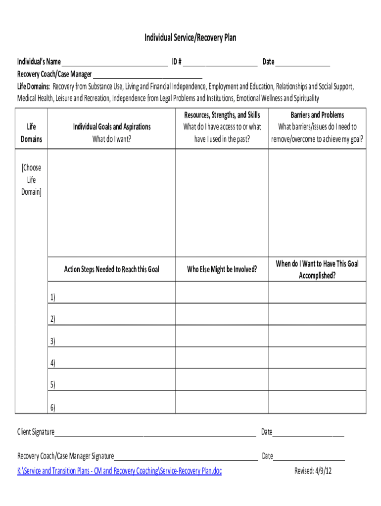 Individual Service/Recovery Plan Individuals Name ___ ID # ___ Date ___ Recovery Coach/Case Manager ___ Life Domains: Recovery from Substance Use, Living and Financial Independence, Employment and