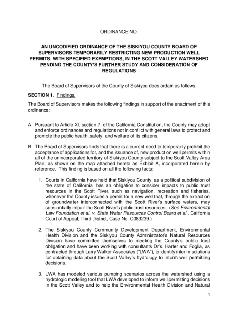 ORDINANCE NO. AN UNCODIFIED ORDINANCE OF THE MISKITO COUNTY BOARD OF SUPERVISORS TEMPORARILY RESTRICTING NEW PRODUCTION WELL PERMITS, WITH SPECIFIED EXEMPTIONS, IN THE SCOTT VALLEY WATERSHED PENDING