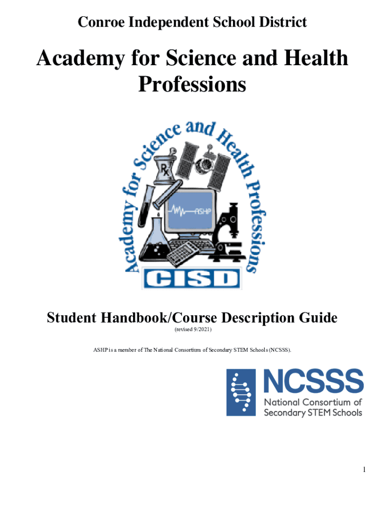 Conroe Independent School DistrictAcademy for Science and Health ProfessionsStudent Handbook/Course Description Guide (revised 9/2021) ASH is a member of The National Consortium of Secondary STEM