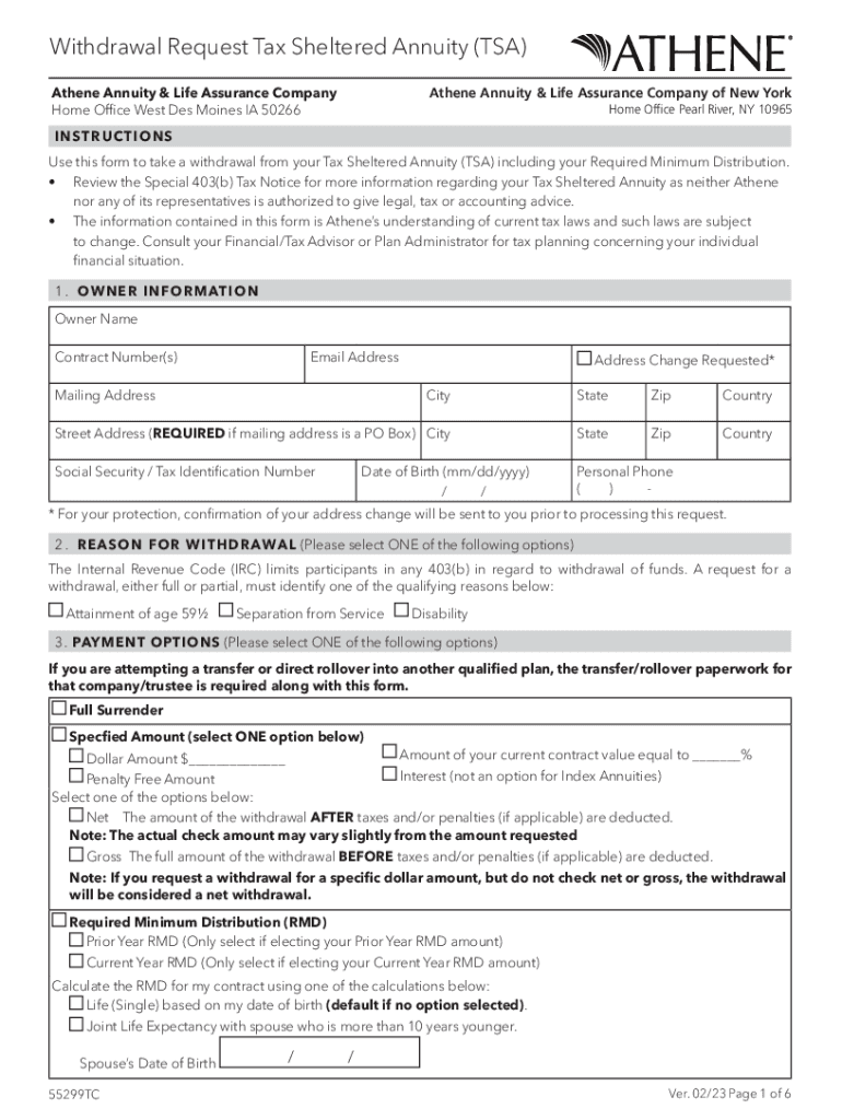 Withdrawal Request Tax Sheltered Annuity (TSA) Athene Annuity & Life Assurance Company Home Office West Des Moines IA 50266Athene Annuity & Life Assurance Company of New York Home Office Pearl River,