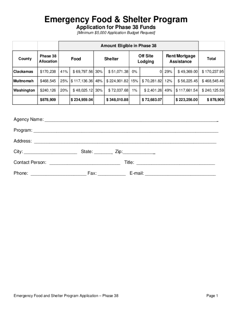 Emergency Food & Shelter Program Application for Phase 38 Funds [Minimum $5,000 Application Budget Request]Amount Eligible in Phase 38 CountyPhase 38 AllocationFoodOff Site LodgingTotal$170,23841%0