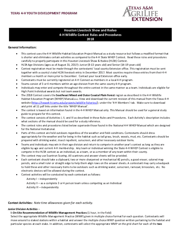 TEXAS 4H YOUTH DEVELOPMENT PROGRAM Houston Livestock Show and Rodeo 4H Wildlife Contest Rules and Procedures 2018 General Information: This contest uses the 4H Wildlife Habitat Education Project Manual