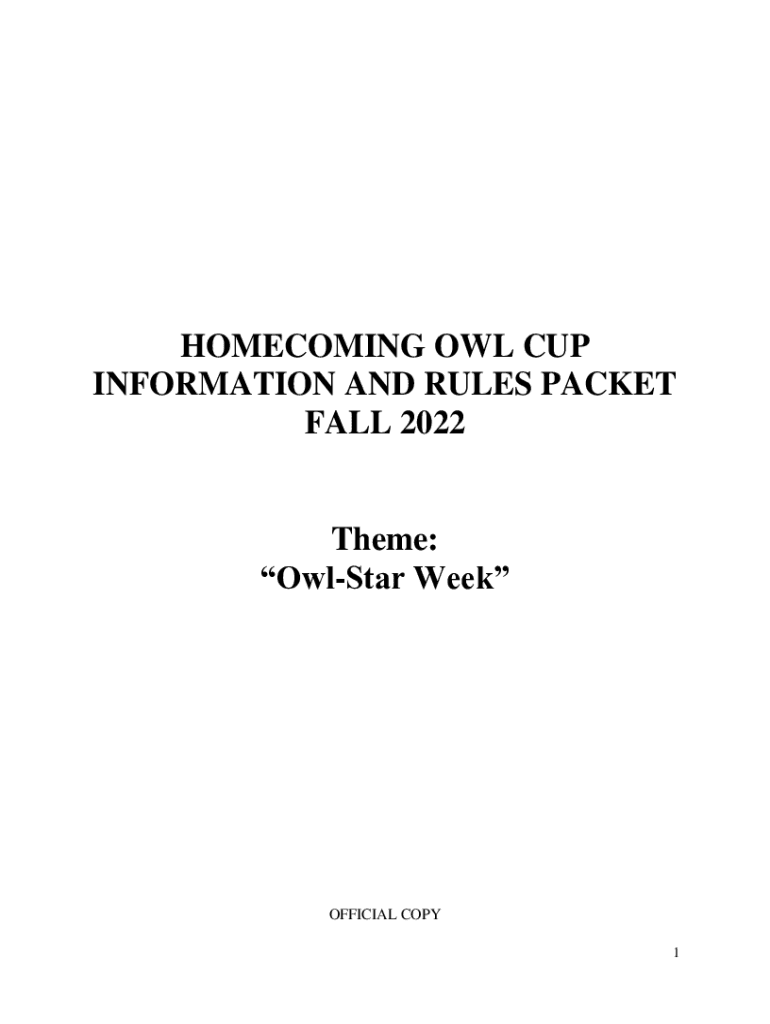 HOMECOMING OWL CUP INFORMATION AND RULES PACKET FALL 2022Theme: Owl Star Semiofficial COPY 1TABLE OF CONTENTS Schedule of Events....3 General Rules and Expectations...4 Registration and Team Structure.5