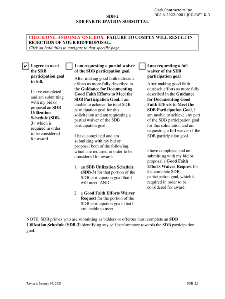 SDB2 SUB PARTICIPATION SUBMITTALClark Contractors, Inc. DGS A20220001JOCSWTK3CHECK ONE, AND ONLY ONE, BOX. FAILURE TO COMPLY WILL RESULT IN REJECTION OF YOUR BID/PROPOSAL. Click on bold titles to