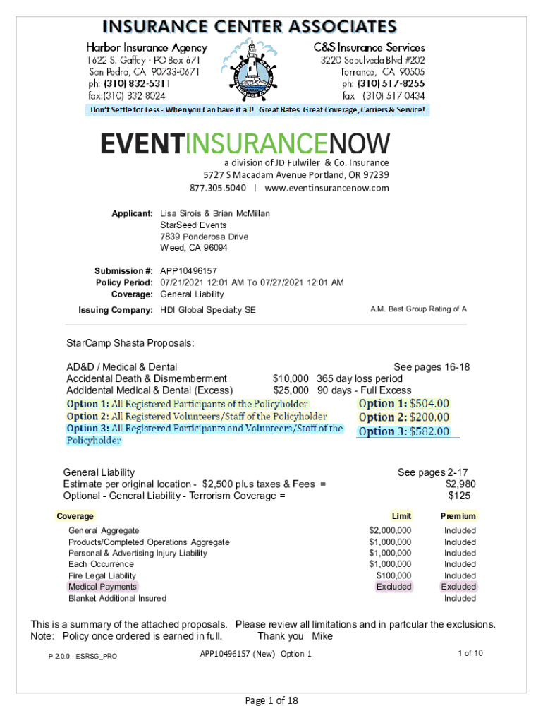 S SA division of JD Fuller & Co. Insurance 5727 S Macadam Avenue Portland, OR 97239 877.305.5040 | www.eventinsurancenow.comS SS Applicant: Lisa Sirius & Brian McMillan Started Events 7839 Ponderosa