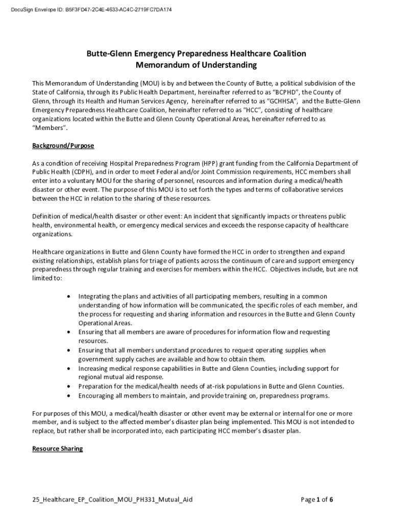 DocuSign Envelope ID: B5F3FD472C4E4633AC4C2719FC7DA174ButteGlennEmergencyPreparednessHealthcareCoalition MemorandumofUnderstanding ThisMemorandumofUnderstanding(YOU)isbyandbetweentheCountyofButte,