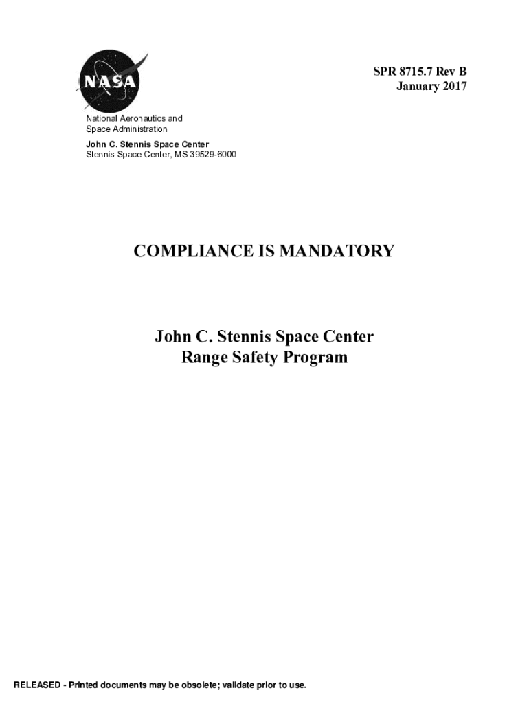SPR 8715.7 Rev B January 2017 National Aeronautics and Space Administration John C. Tennis Space Center Tennis Space Center, MS 395296000COMPLIANCE IS MANDATORY John C. Tennis Space Center Range Safety