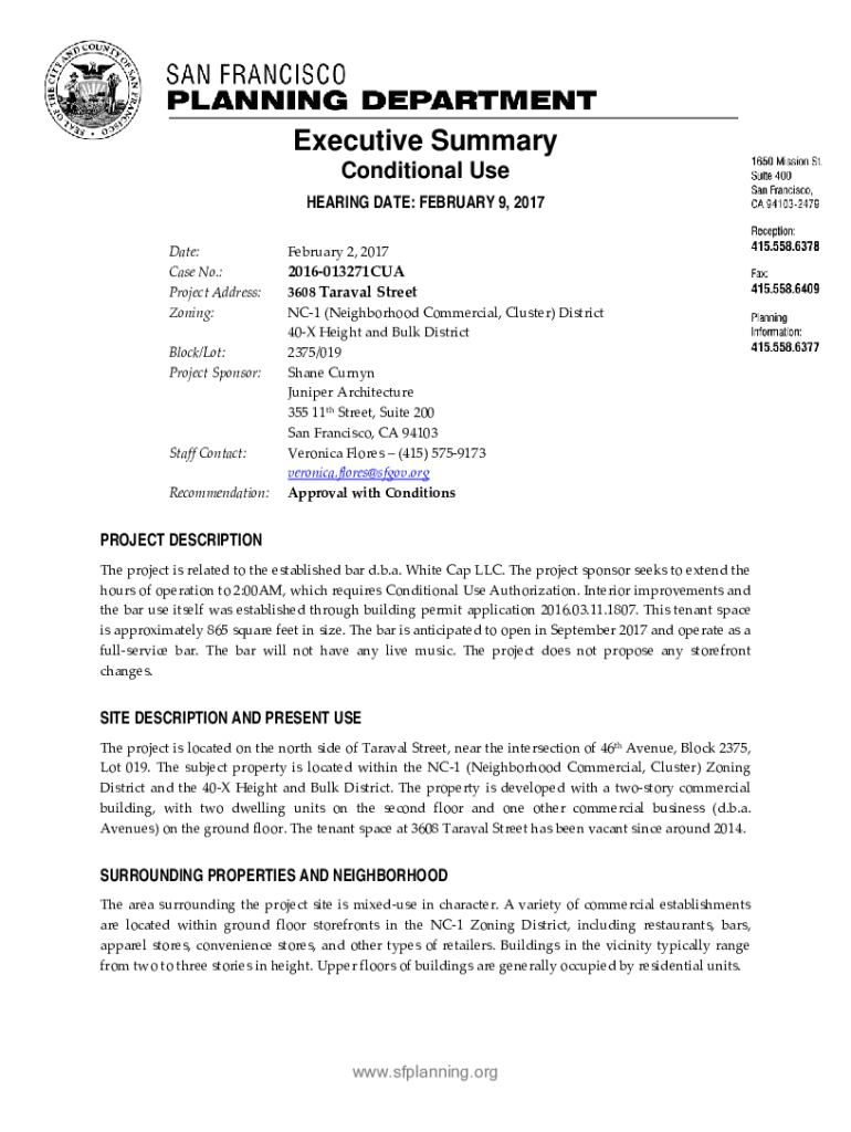 Executive Summary Conditional Use HEARING DATE: FEBRUARY 9, 2017, Date: Case No.: Project Address: Zoning: Block/Lot: Project Sponsor:Staff Contact: Recommendation:February 2, 20172016013271CUA 3608