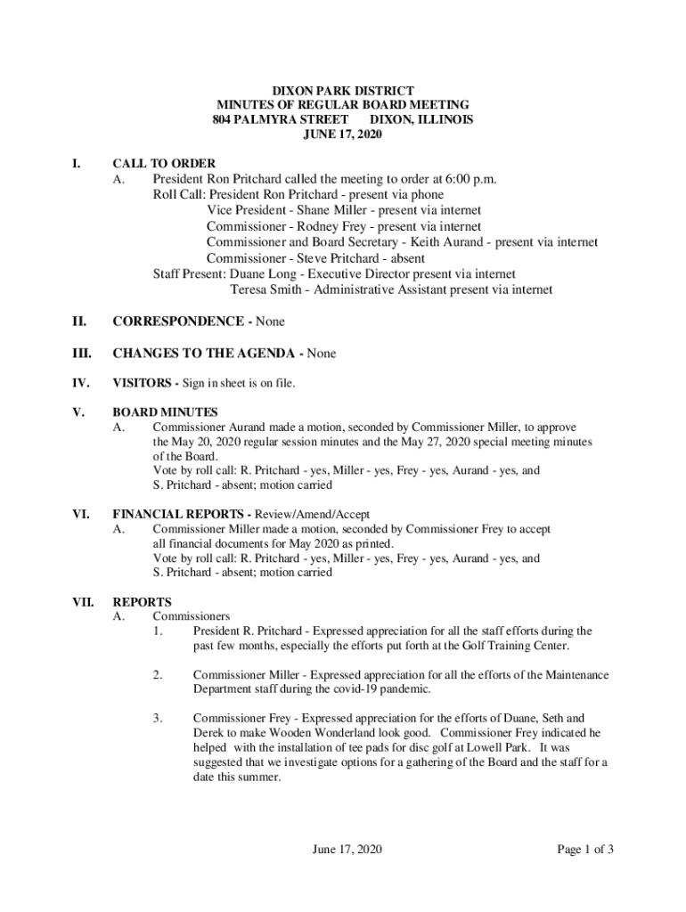 DIXON PARK DISTRICT MINUTES OF REGULAR BOARD MEETING 804 PALMYRA STREET DIXON, ILLINOIS JUNE 17, 2020, I.CALL TO ORDER A. President Ron Pritchard called the meeting to order at 6:00 p.m. Roll Call: