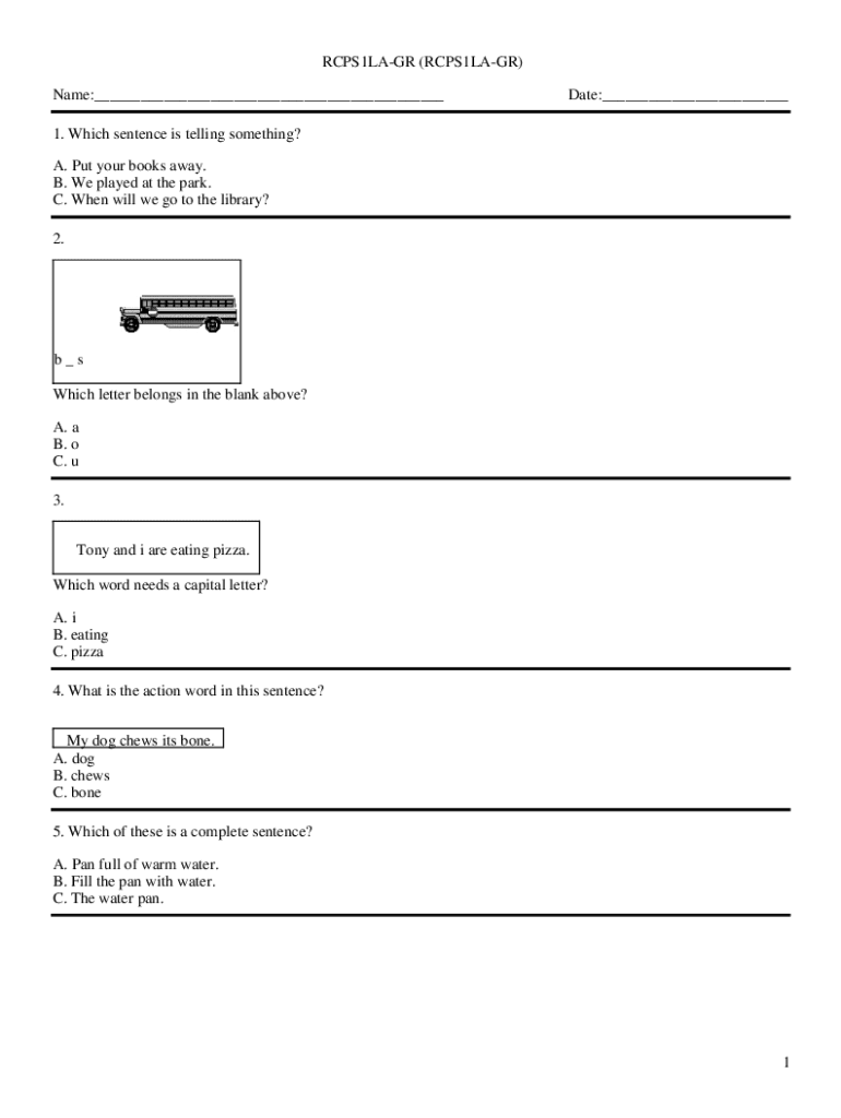 RCPS1LAGR (RCPS1LAGR) Name:___Date:___1. Which sentence is telling something? A. Put your books away. B. We played at the park. C. When will we go to the library? 2.b_s Which letter belongs in the