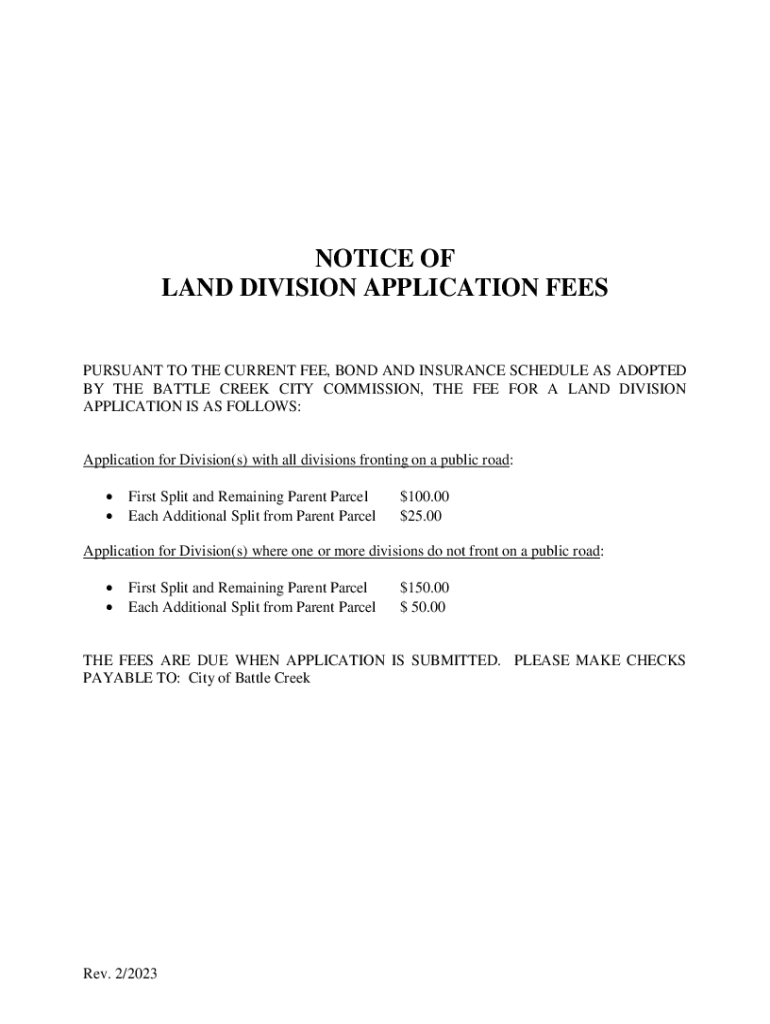 NOTICE OF LAND DIVISION APPLICATION FEES PURSUANT TO THE CURRENT FEE, BOND AND INSURANCE SCHEDULE AS ADOPTED BY THE BATTLE CREEK CITY COMMISSION, THE FEE FOR A LAND DIVISION APPLICATION IS AS FOLLOWS:Application