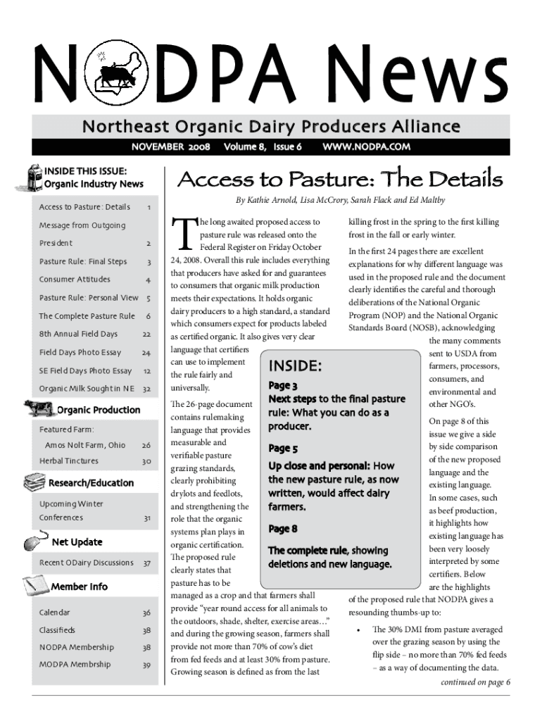 N DPA News Northeast Organic Dairy Producers Alliance NOVEMBER 2008 INSIDE THIS ISSUE: Organic Industry News Access to Pasture: Details1President2Pasture Rule: Final Steps3Consumer Attitudes4Pasture