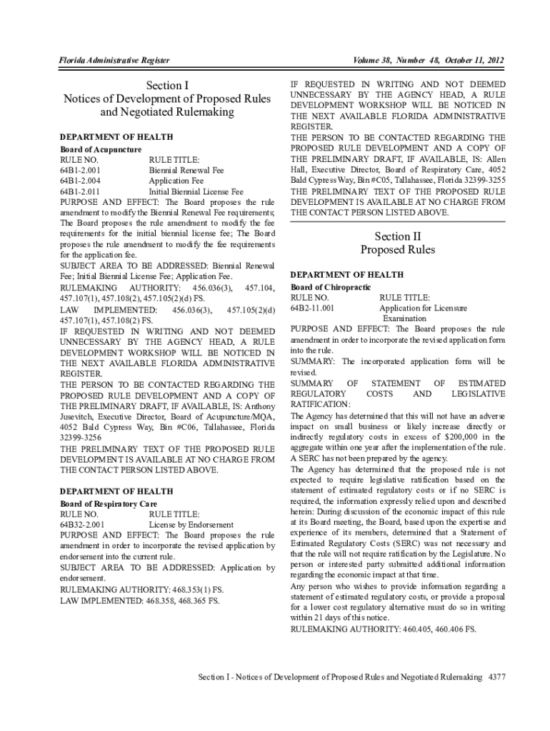 Florida Administrative RegisterVolume 38, Number 48, October 11, 2012Section I Notice of Development of Proposed Rules and Negotiated Rule making DEPARTMENT OF HEALTH Board of Acupuncture RULE NO.