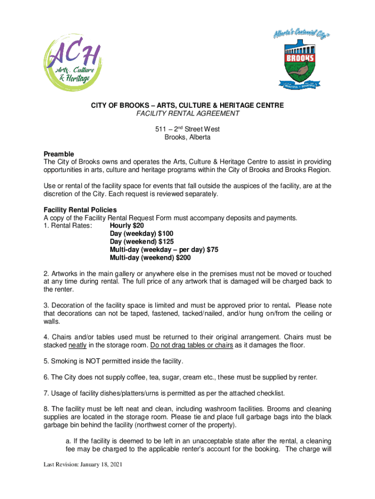 CITY OF BROOKS ARTS, CULTURE & HERITAGE Center FACILITY RENTAL AGREEMENT 511 2nd Street West Brooks, Alberta Preamble The City of Brooks owns and operates the Arts, Culture & Heritage Center to assist