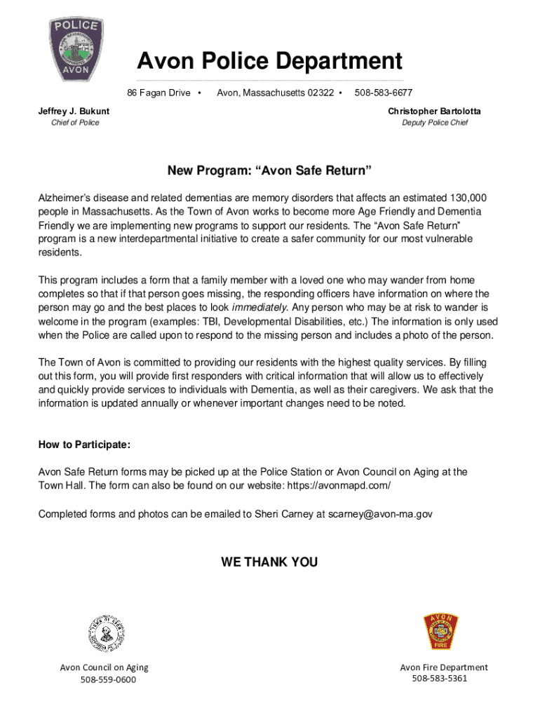 Avon Police Department ___86 Pagan Drive Avon, Massachusetts 02322 5085836677Jeffrey J. BukuntChristopher BartolottaChief of PoliceDeputy Police Chiefer Program: Avon Safe Return Alzheimer's disease