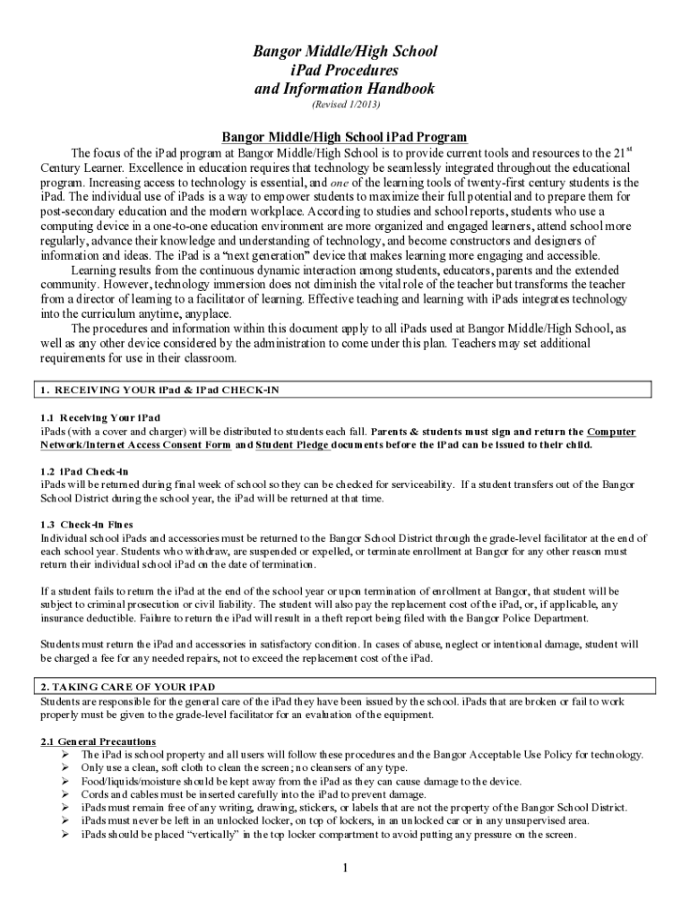 Bangor Middle/High School iPad Procedures and Information Handbook (Revised 1/2013)Bangor Middle/High School iPad Program focus of the iPad program at Bangor Middle/High School is to provide current