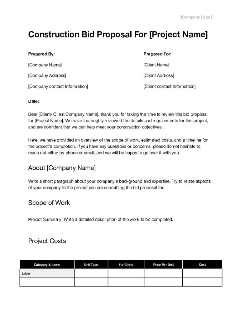 Construction Bid Proposal Template is not the form you're looking for?Search for another form here.
