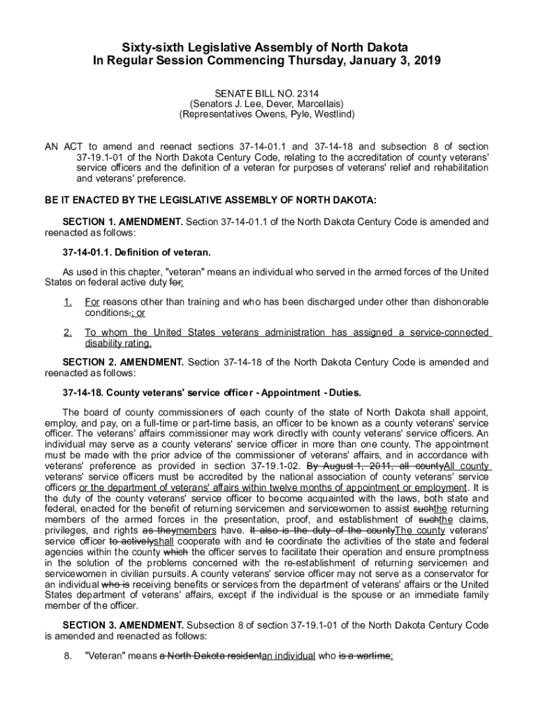 Sixty-sixth Legislative Assemblies of North Dakota In Regular Session Commencing Thursday, January 3, 2019, SENATE BILL NO. 2314 (Senators J. Lee, Never, Marcella is) (Representatives Owens, Pyle,