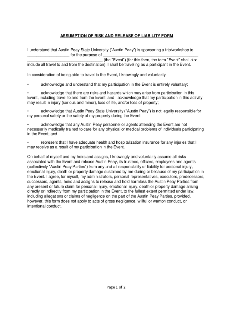 ASSUMPTION OF RISK AND RELEASE OF LIABILITY FORM I understand that Austin Play State University (Austin Play) is sponsoring a trip/workshop to ___ for the purpose of ___ ___ (the Event) (for this