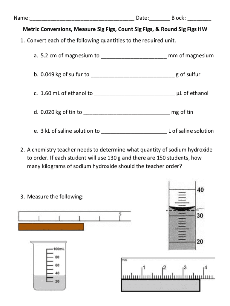 Name:___ Date:___ Block: ___ Metric Conversions, Measure SIG Figs, Count SIG Figs, & Round SIG Figs HW 1. Convert each of the following quantities to the required unit. a. 5.2 cm of magnesium to ___