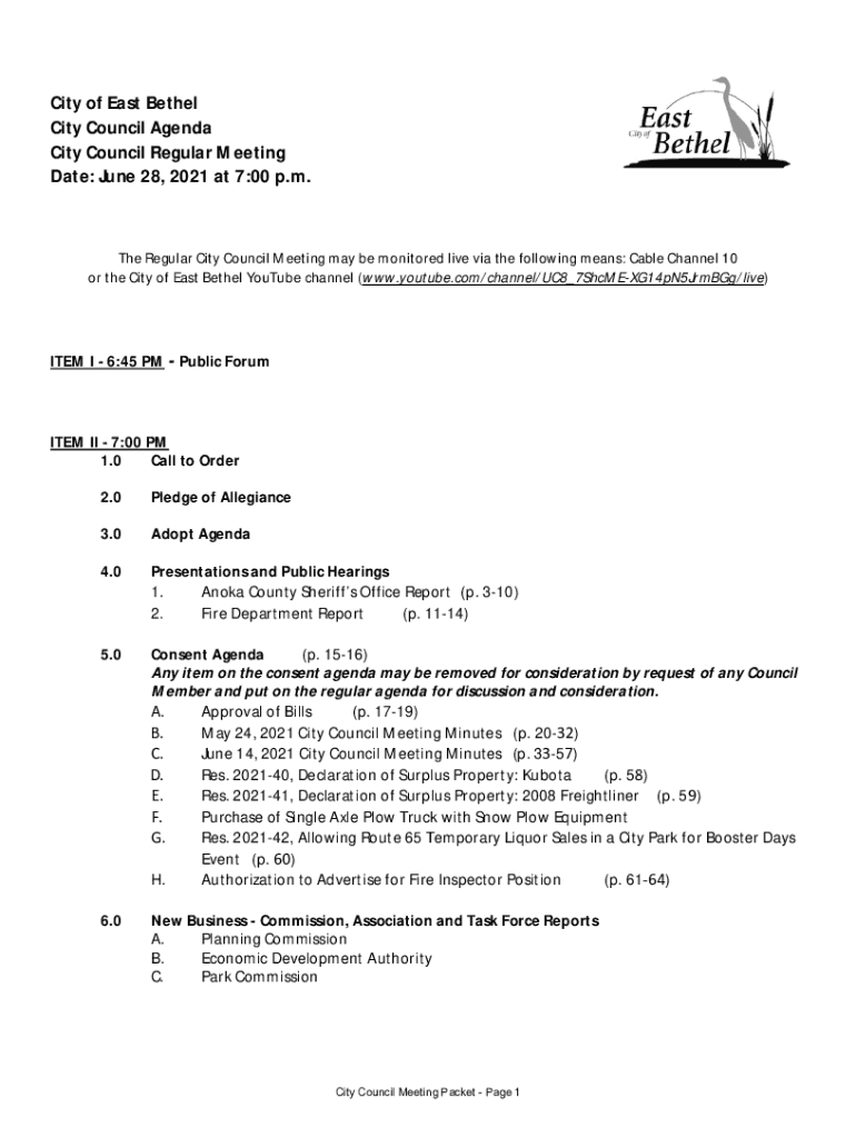 City of East Ethel City Council Agenda City Council Regular Meeting Date: June 28, 2021, at 7:00 p.m. The Regular City Council Meeting may be monitored live via the following means: Cable Channel