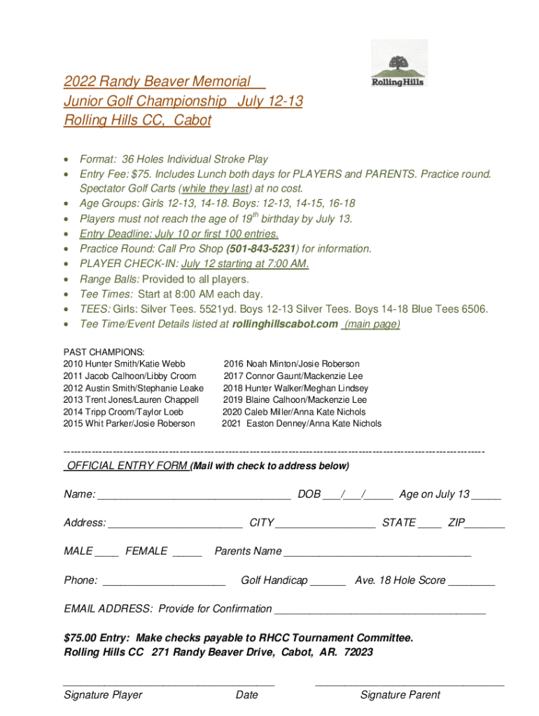 2022 Randy Beaver Memorial Junior Golf Championship July 1213 Rolling Hills CC, Cabot Format: 36 Holes Individual Stroke Play Entry Fee: $75. Includes Lunch both days for PLAYERS and PARENTS. Practice