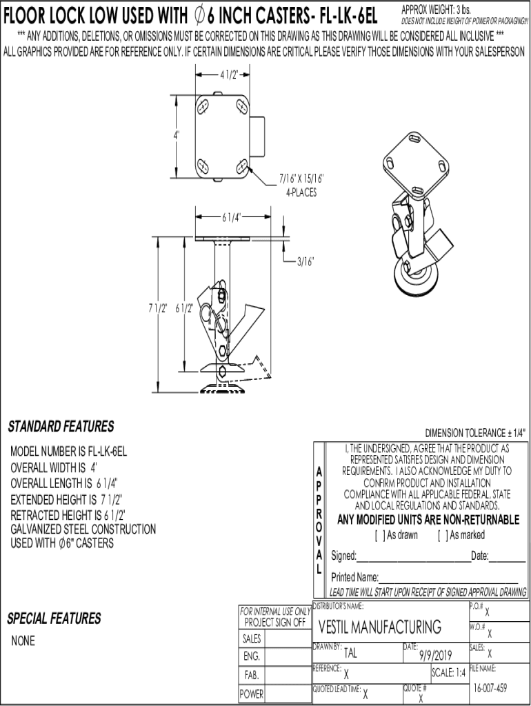 FLOOR LOCK LOW USED WITH6 INCH CASTERS FLLK6ELAPPROX WEIGHT: 3 lbs. DOES NOT INCLUDE WEIGHT OF POWER OR PACKAGING!!!*** ANY ADDITIONS, DELETIONS, OR OMISSIONS MUST BE CORRECTED ON THIS DRAWING AS