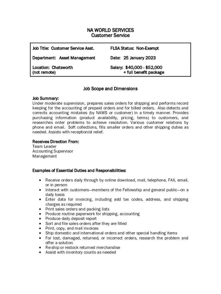 NA WORLD SERVICES Customer Service Job Title: Customer Service Asst. FLEA Status: NonExemptDepartment: Asset ManagementDate: 25 January 2023Location: Chats worth (not remote)Salary: $$40,00052,000